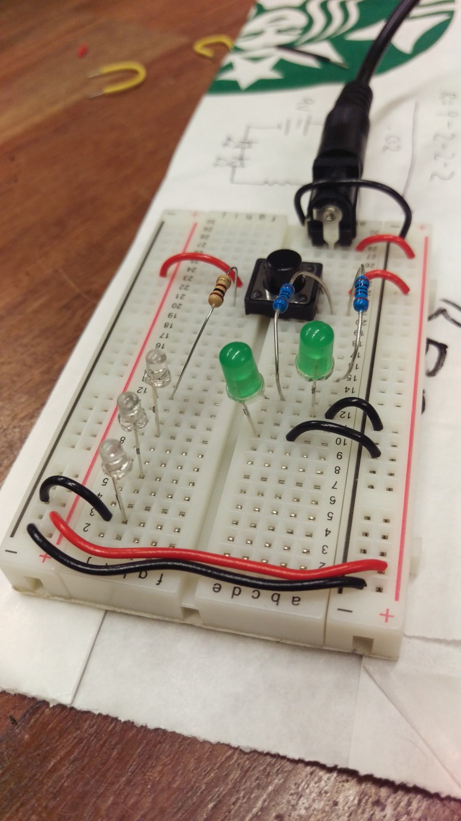 Parts: jumper wires, breadboard, LEDs, resistors, power supplies, barrel jack connector, voltage regulator.