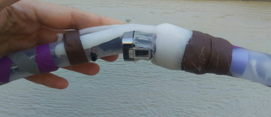 Because the tube is translucent, the sensor wasn’t triggering the score function in bright sunlight, so I took a piece of heat shrink tubing and cut a small piece to limit the field of light hitting the sensor. This worked quite well. The company I got the tubing from included a short piece of smaller diameter tube that fits snugly inside the hoop to give a hula hoop some structural stability, so I used this piece to house my sensor.